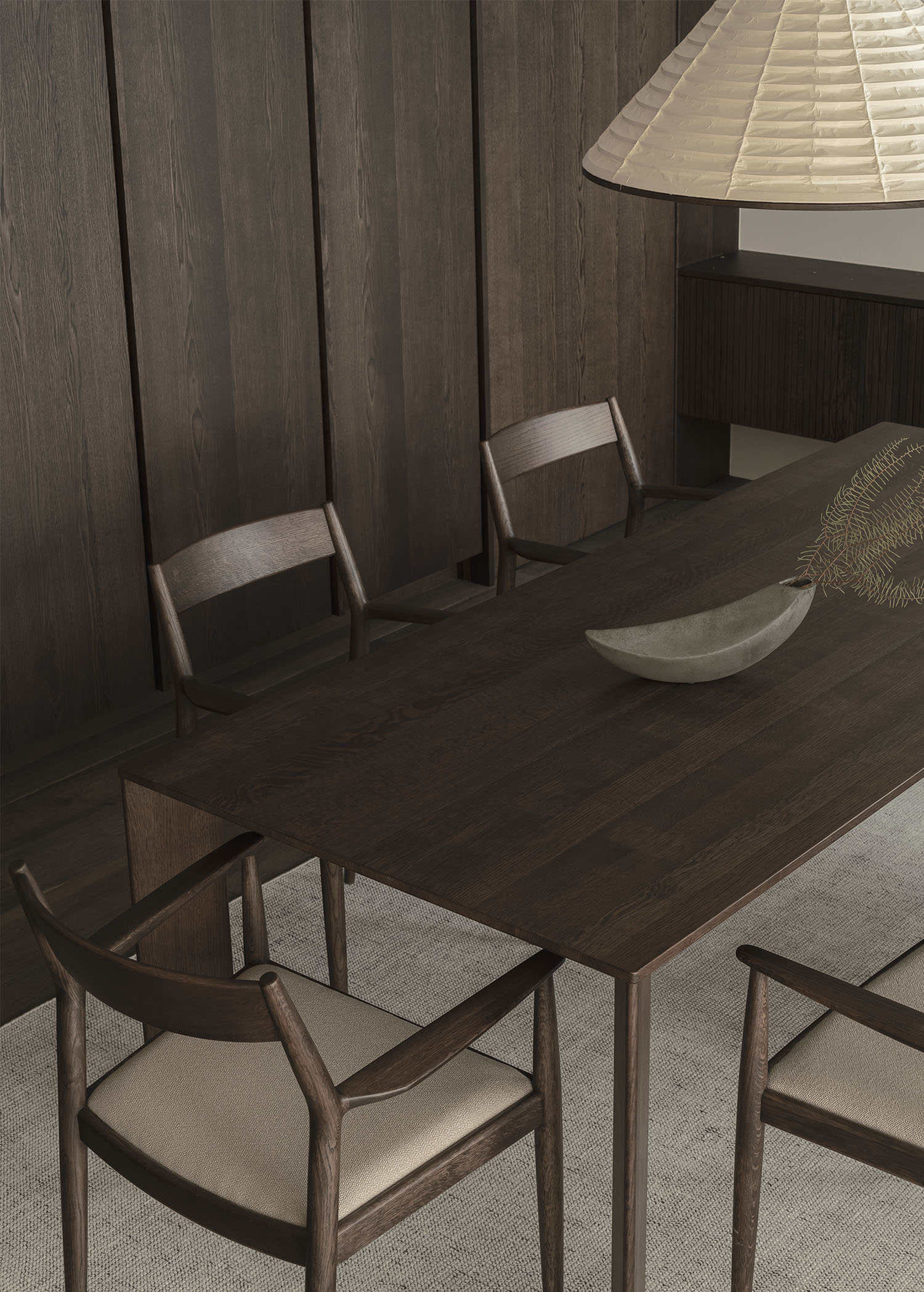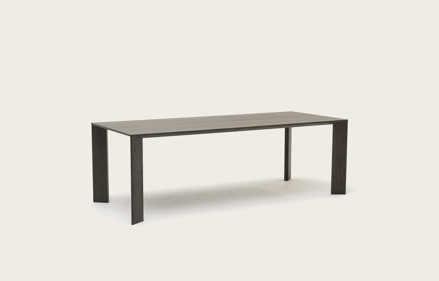 The angle at which the cross section of each leg is attached gives the table a unique structural elegance and supports the tabletop, superseding the need for aprons. When placed in a context, the wooden table seems to float in effortless interplay with its surroundings, elevating the atmosphere and character of the space. In spite of its size, the table appears light and discreet, allowing the organic form of the chairs placed around it to stand out.