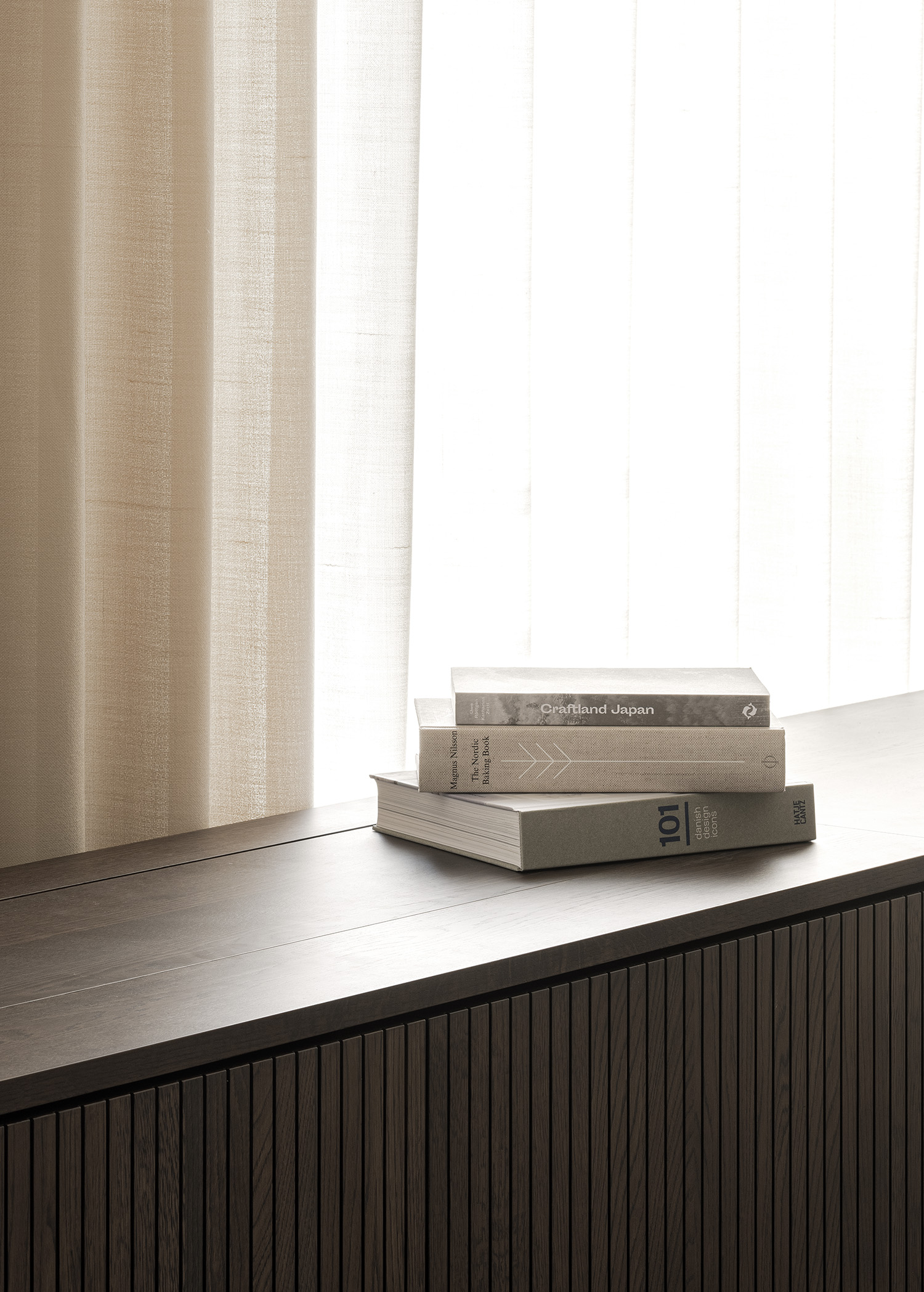 このインテリアデザインは、芦沢啓治建築設計事務所とノーム・アーキテクツのコラボレーションにより完成し、これまでのケースと同じく、日本と北欧のデザインの原則や美意識を融合しています。天然素材や落ち着いた色調を使用するという共通の理念がこのプロジェクトの基礎にあり、触り心地のよさや、ソフトミニマルで時代を超えた品質に重きを置いている点が特徴です。