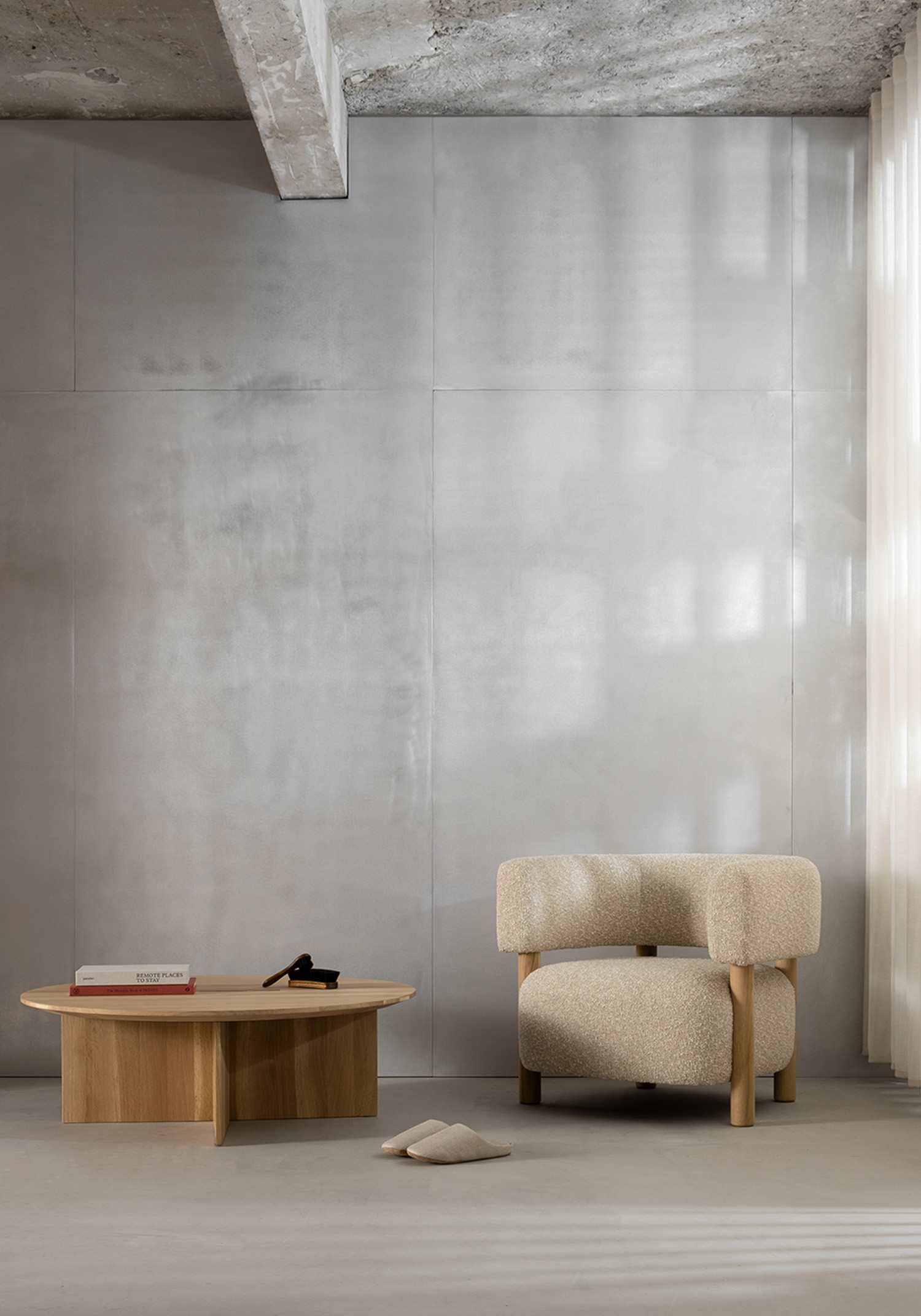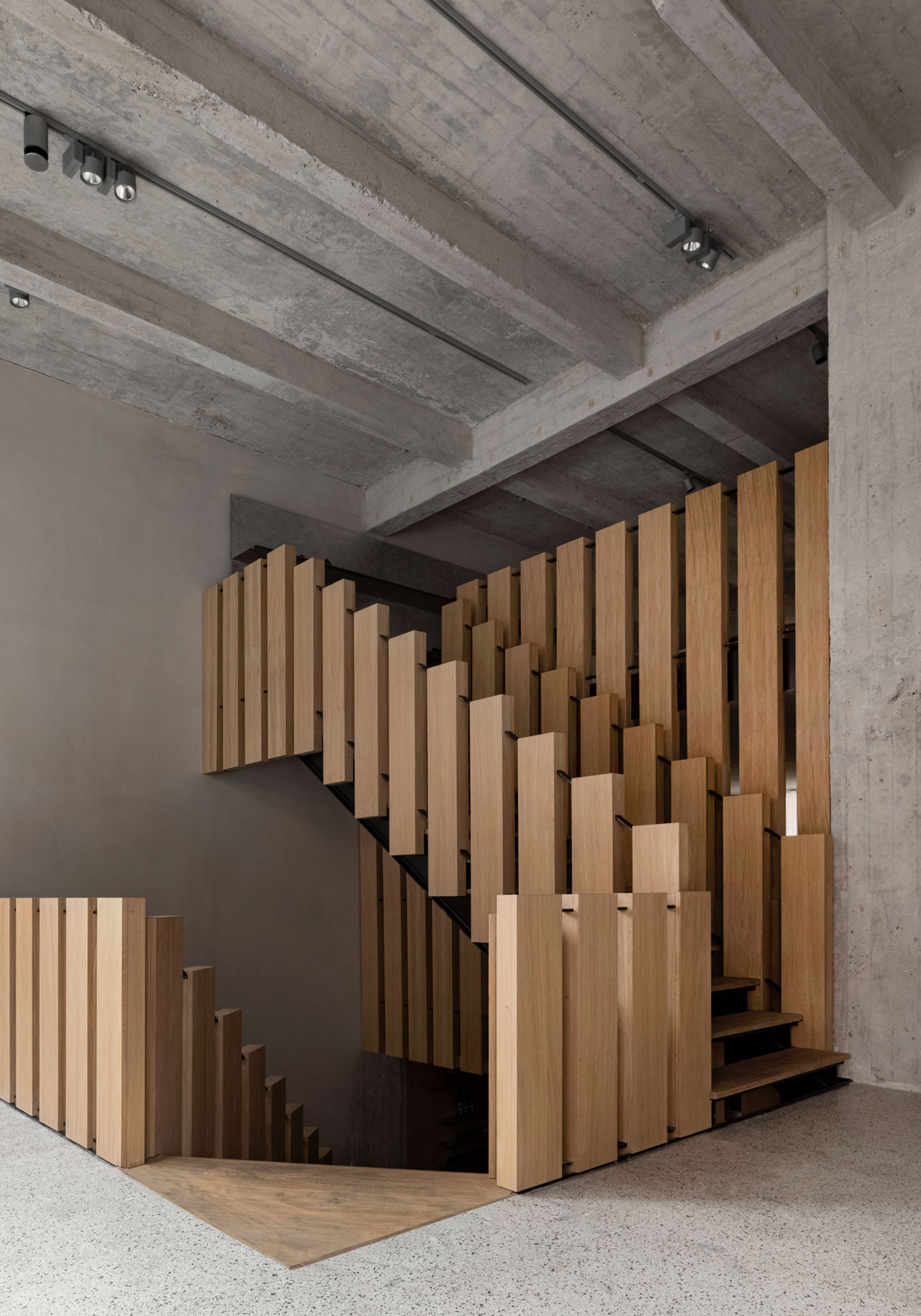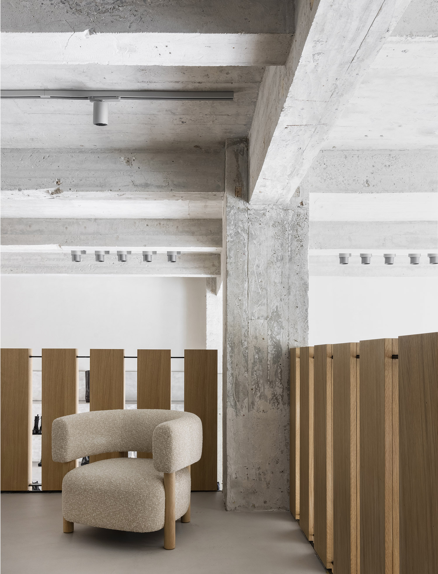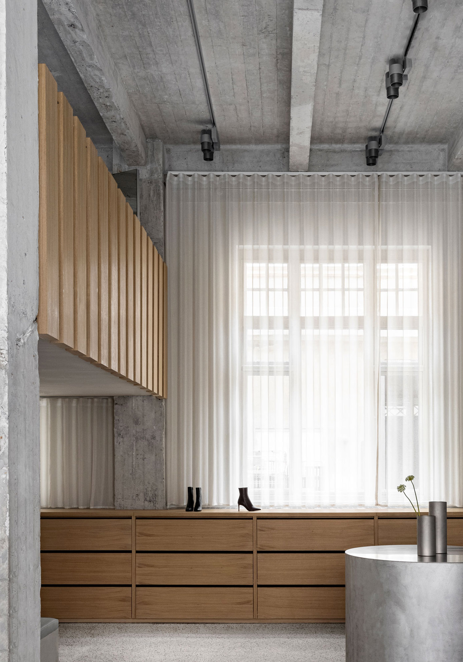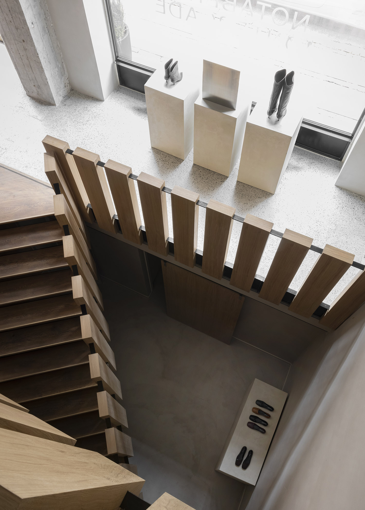 「アーティストのアトリエのような商業スペースのイメージは、削ぎ落されたウェアハウスの様式美と気配を取り入れ、台座により強調されています。この店内の台座では、さまざまな素材を採用していながらも調和の取れているマテリアルパレットに置かれたアートワークのように、靴をディスプレイしています。」