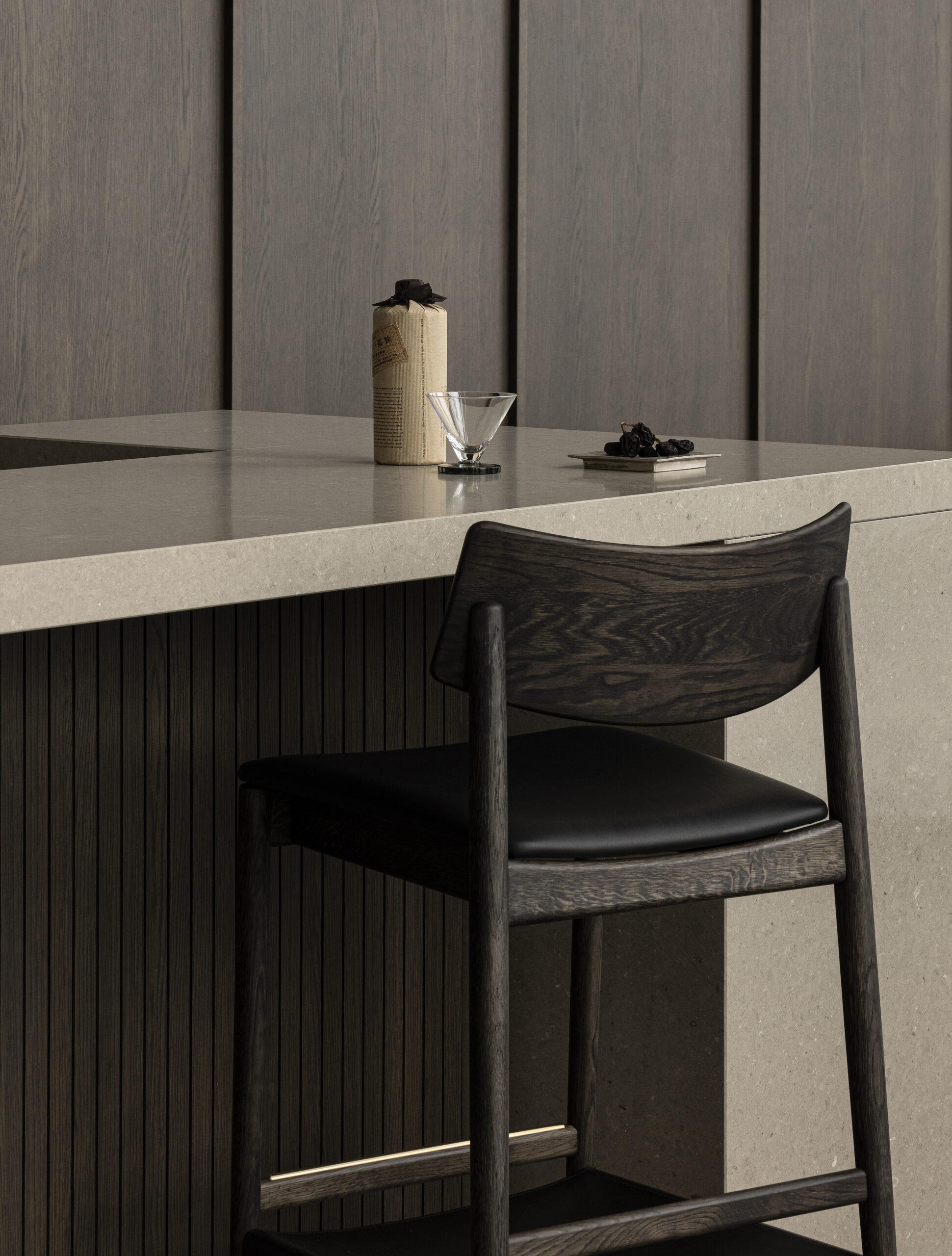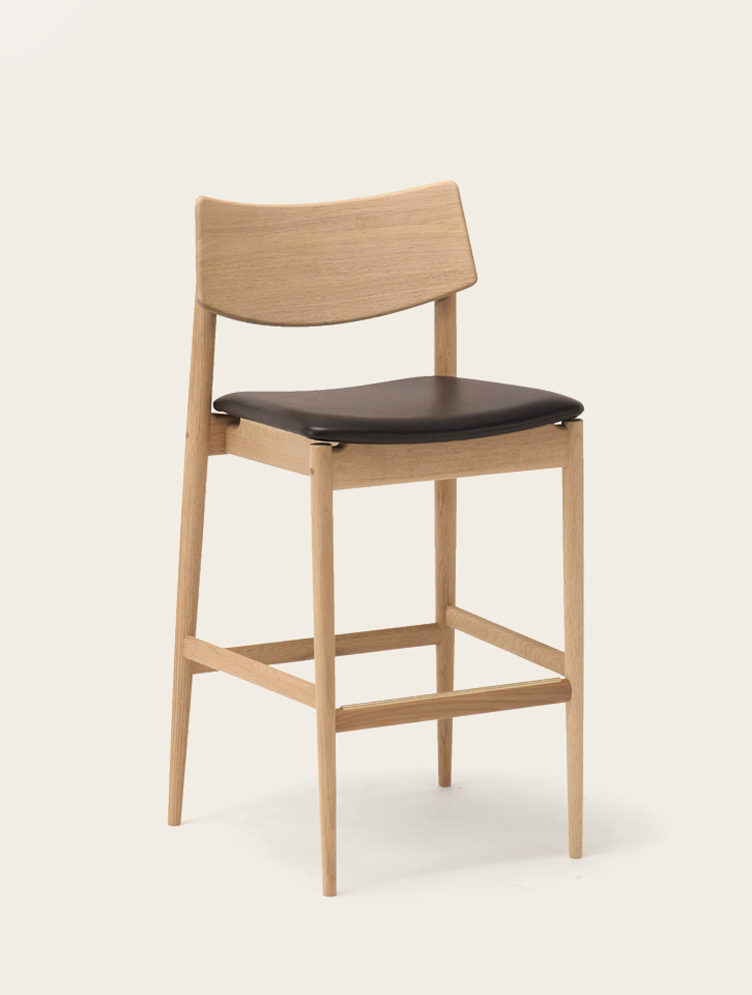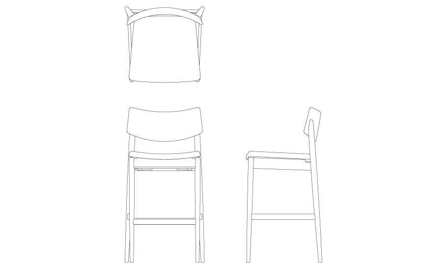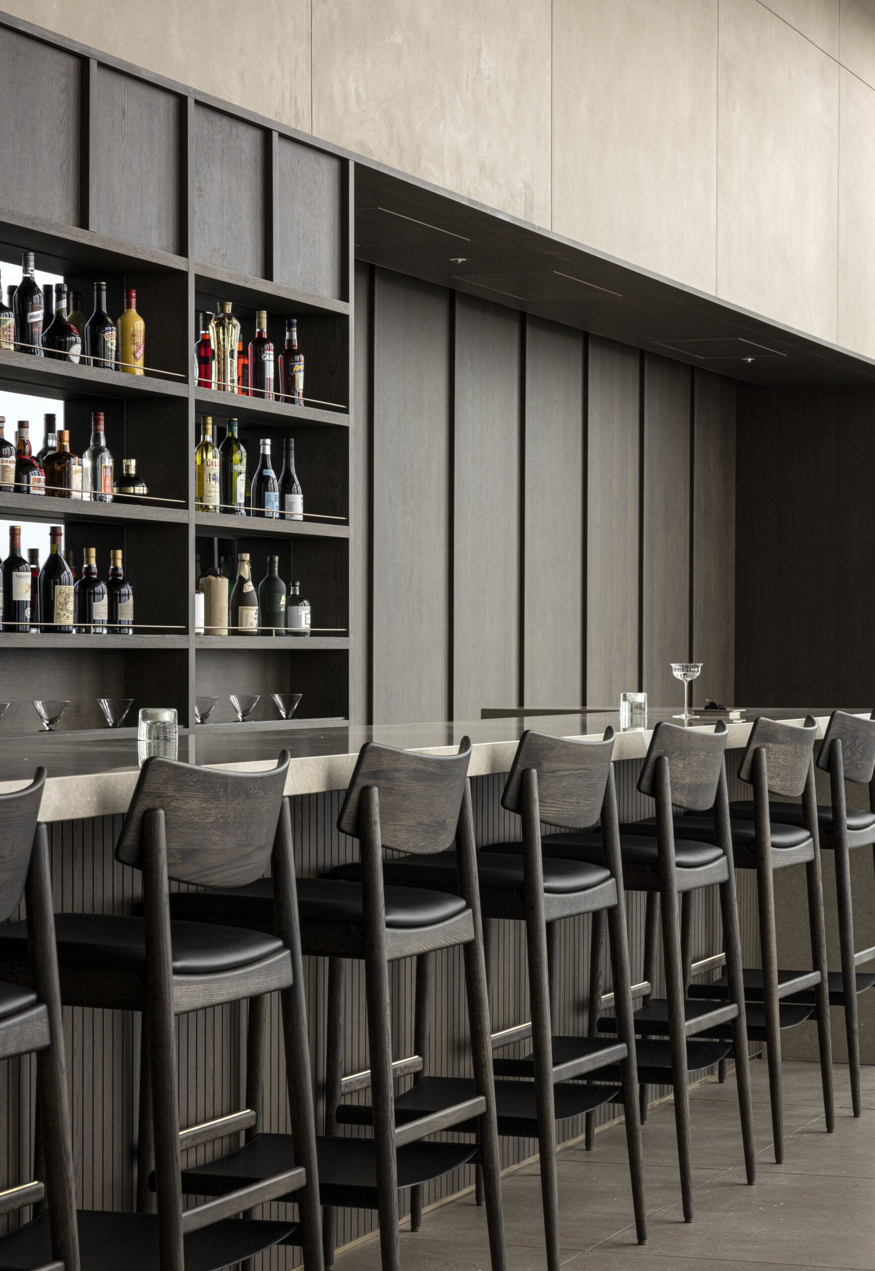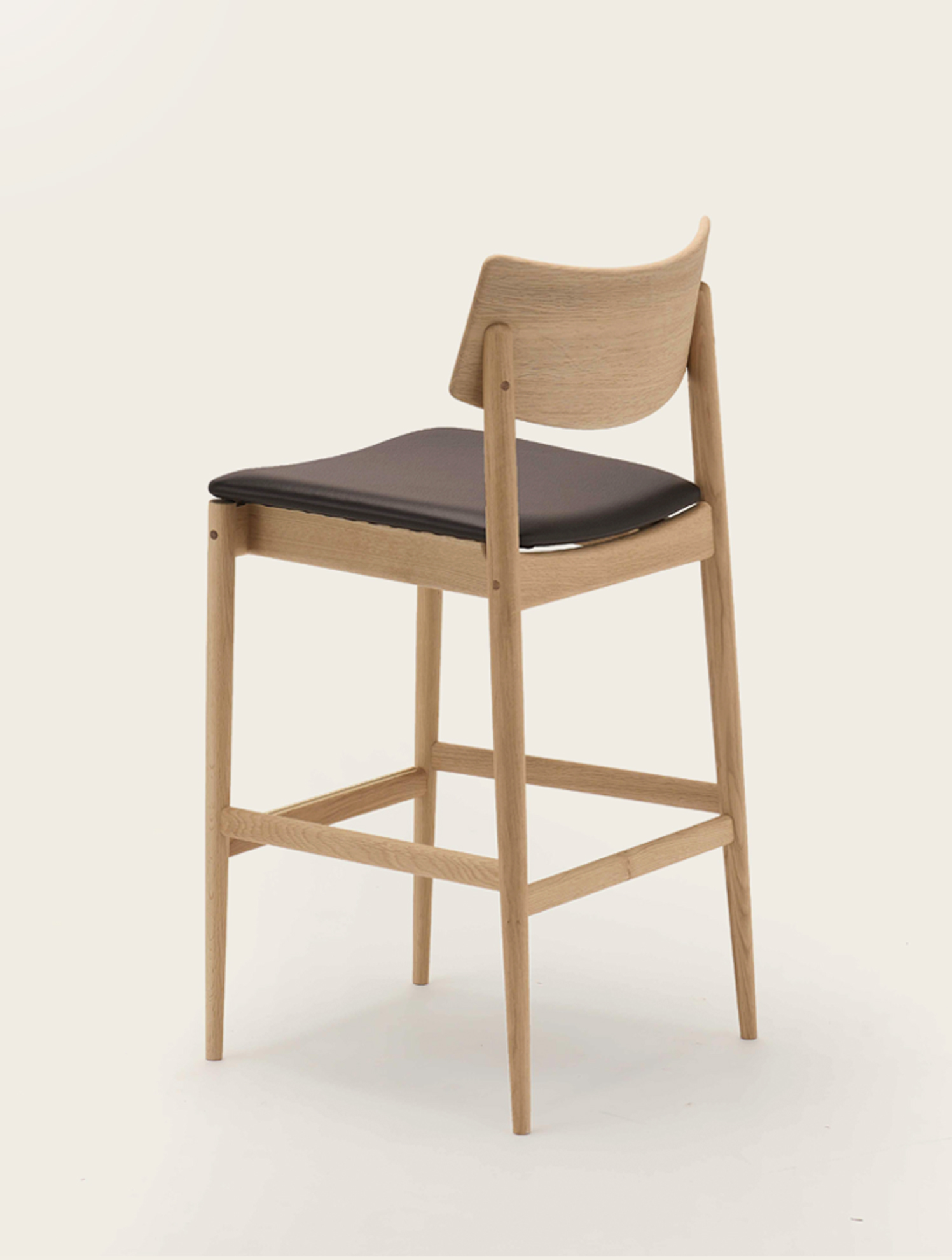 BELLUSTAR TOKYO, A Pan Pacific Hotelのバーカウンターを設計する中でデザインされたこのバースツールは、座面をクッションの張地とし、背もたれを無垢材の削り出しにすることで、心地よさを感じるデザインとしました。