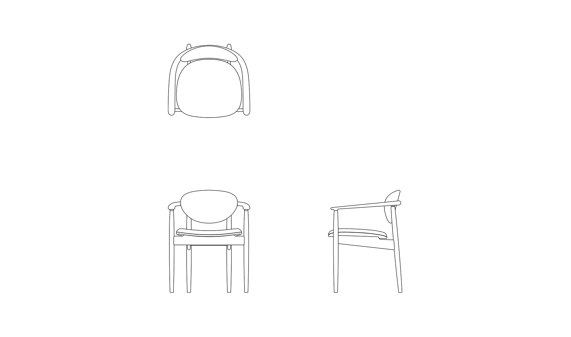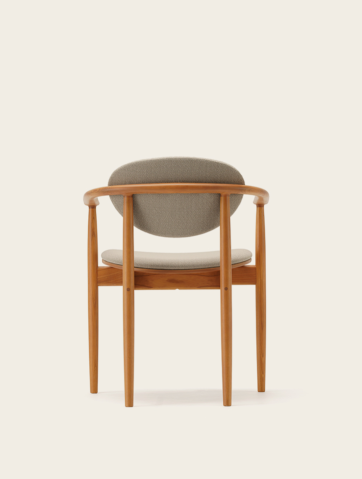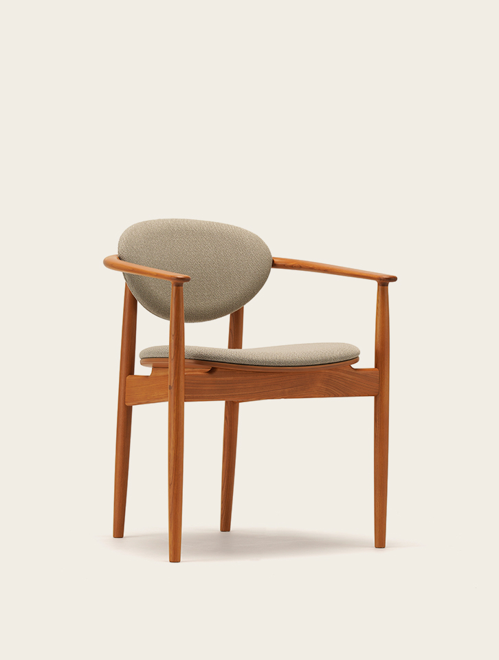 食事をしながらゆったりと会話ができる、丸みを帯びたアームチェア。背もたれと座面の両方に柔らかいクッションを張ることで座り心地のよいくつろぎの時間をもたらします。クッションを使いつつも無垢材の細身のラインにより全体的に重さを感じることがなく、ダイニングテーブルの周りに軽やかな雰囲気を醸し出します。