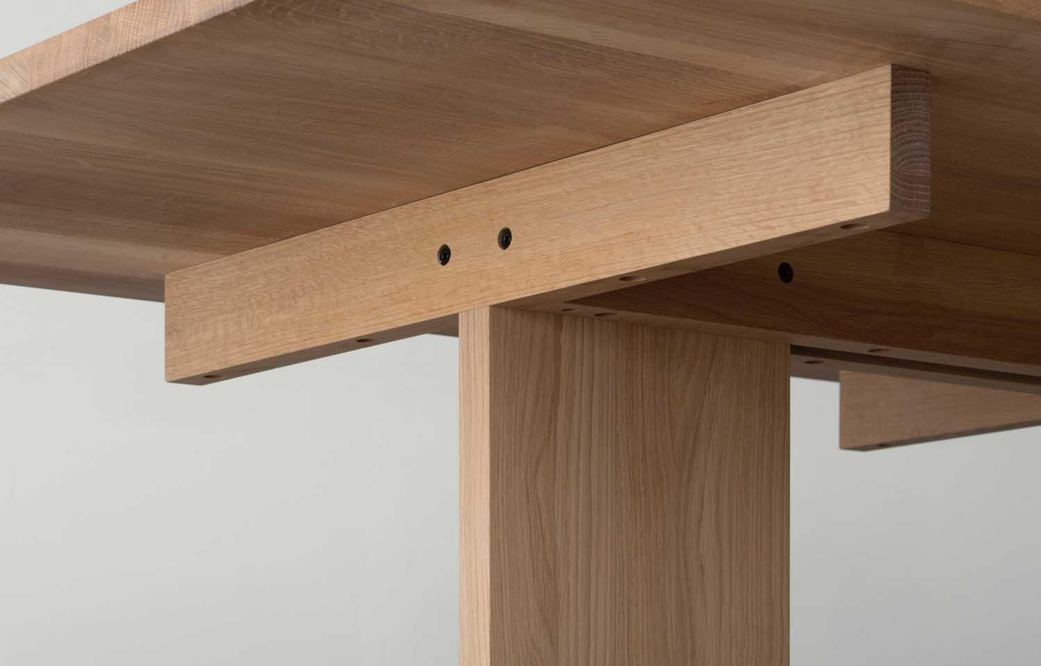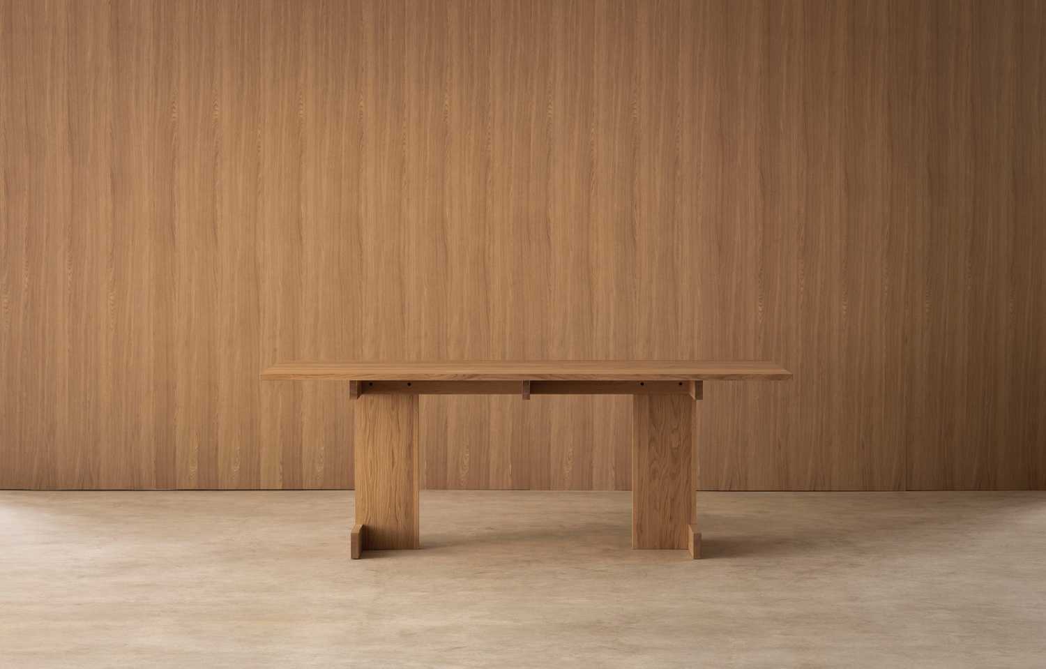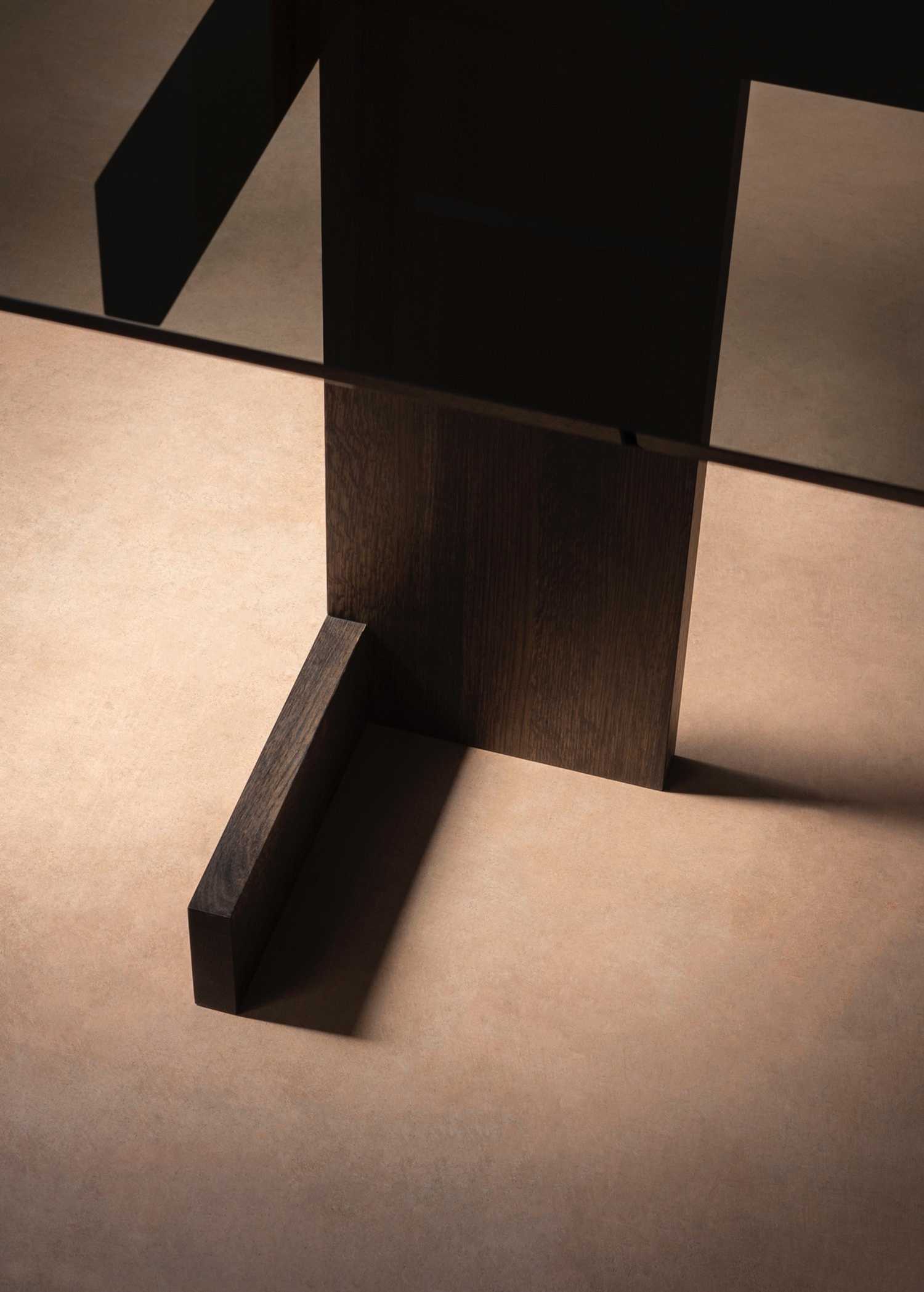 リノベーションに際し、むき出しになった砧アパートの粗野な美からアイディアを得て、アパートの幾何学的なデザインをテーブルの構造に反映しました。ガラストップから見える、削ぎ落されたシンプルな構造が、素材の持つ美しさを際立たせます。同シリーズの椅子と合わせることで、空間に、暖かく、リラックスした雰囲気を生み出します。