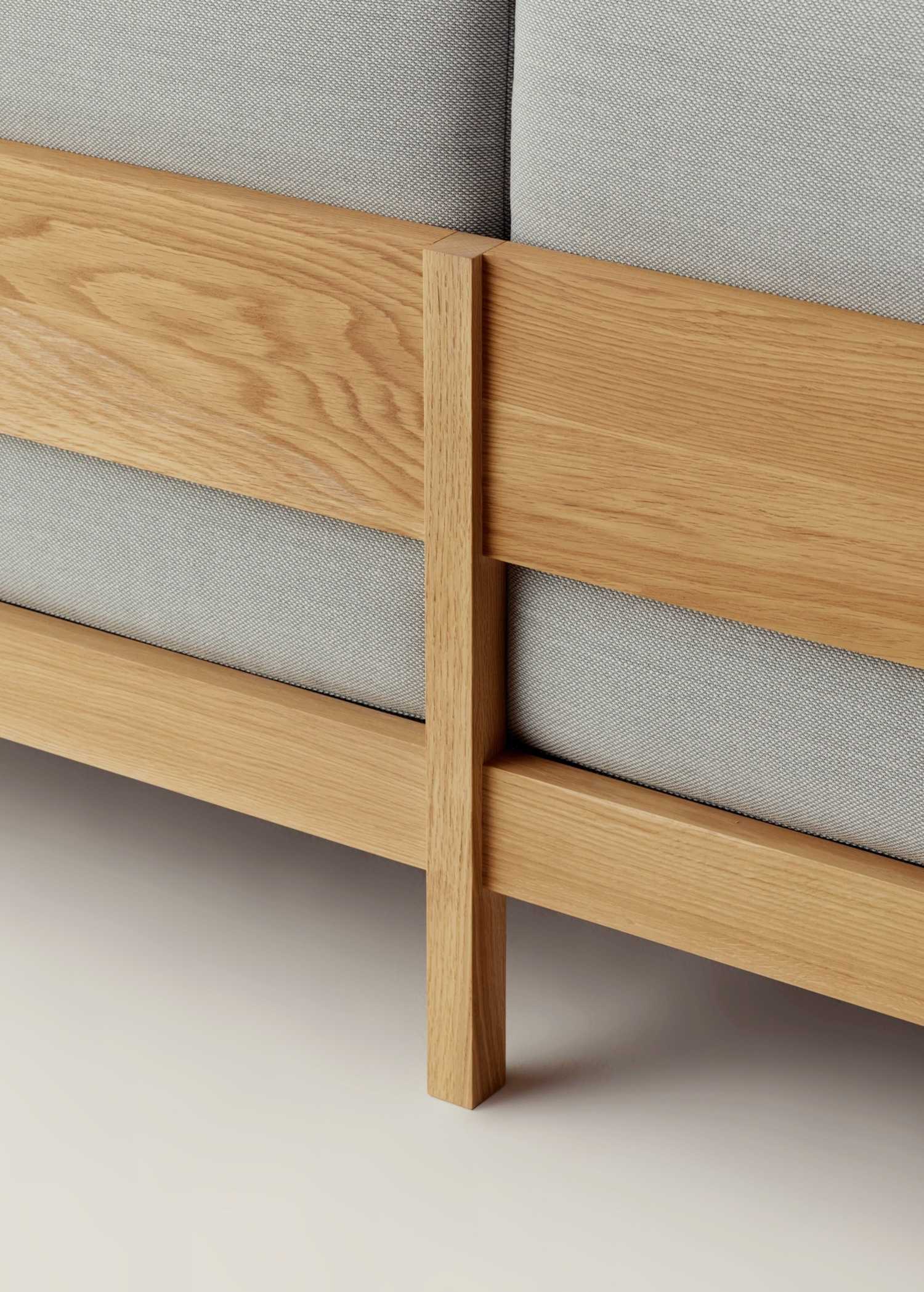 テーブルと同じ構造をソファにも活用し、彫刻的な美しさとリラックスした雰囲気をソファに持たせました。加えて、高さを空間にあわせて低めに設定しているため、圧迫感を感じさせません。アームレストは枕としても使用でき、快適なデイベッドとしても利用できる多機能性を誇ります。