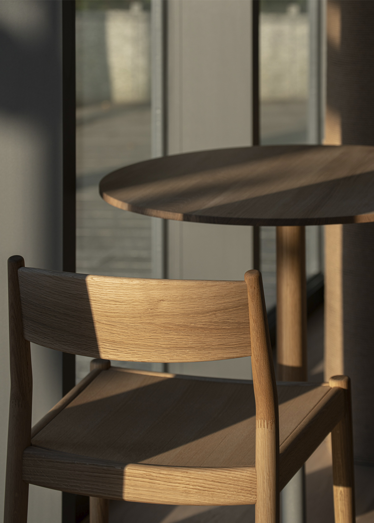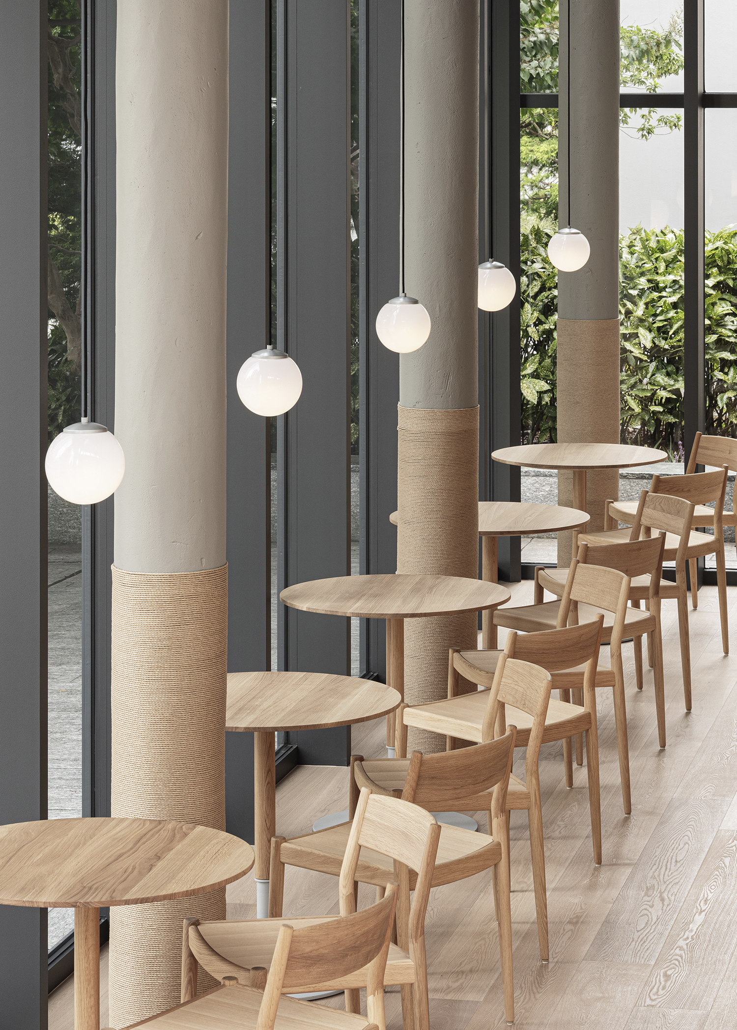 砧にあるアパートメントのために作られたダイニングチェアを発展させ、ブルーボトルコーヒー みなとみらいのために、より軽くスリムにしました。それにより元のキャラクターを失うことなく、フレキシブル且つ多目的なチェアが完成しました。ソフトで温かみのある木が、住宅のような心地よい空気をカフェにもたらします。
