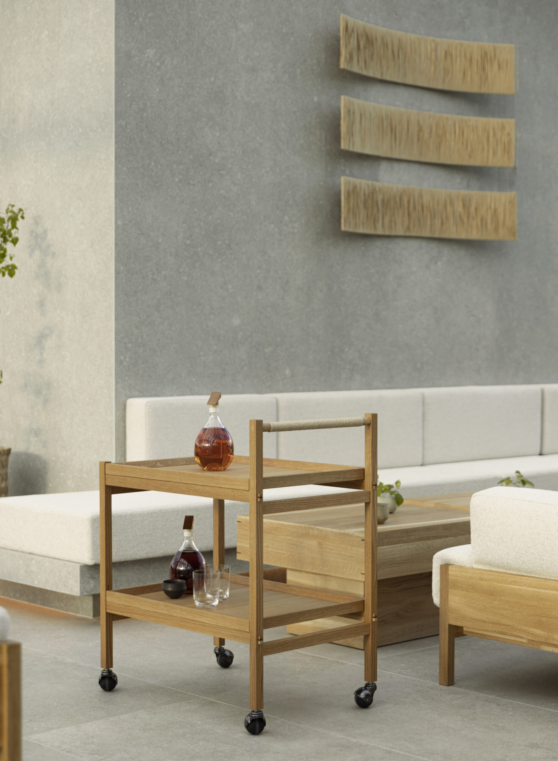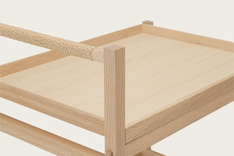 寺社仏閣の入り口に置かれた、傘立てや下駄箱からインスピレーションを得て制作されました。いままでのコレクションのさまざまなディテールに、シェルフシステムと似た構造を持つコントラストカラーを効かせた建具と、コレクション全体の一貫性を生み出す、優れたテクスチャの編み込みハンドルを加えました。