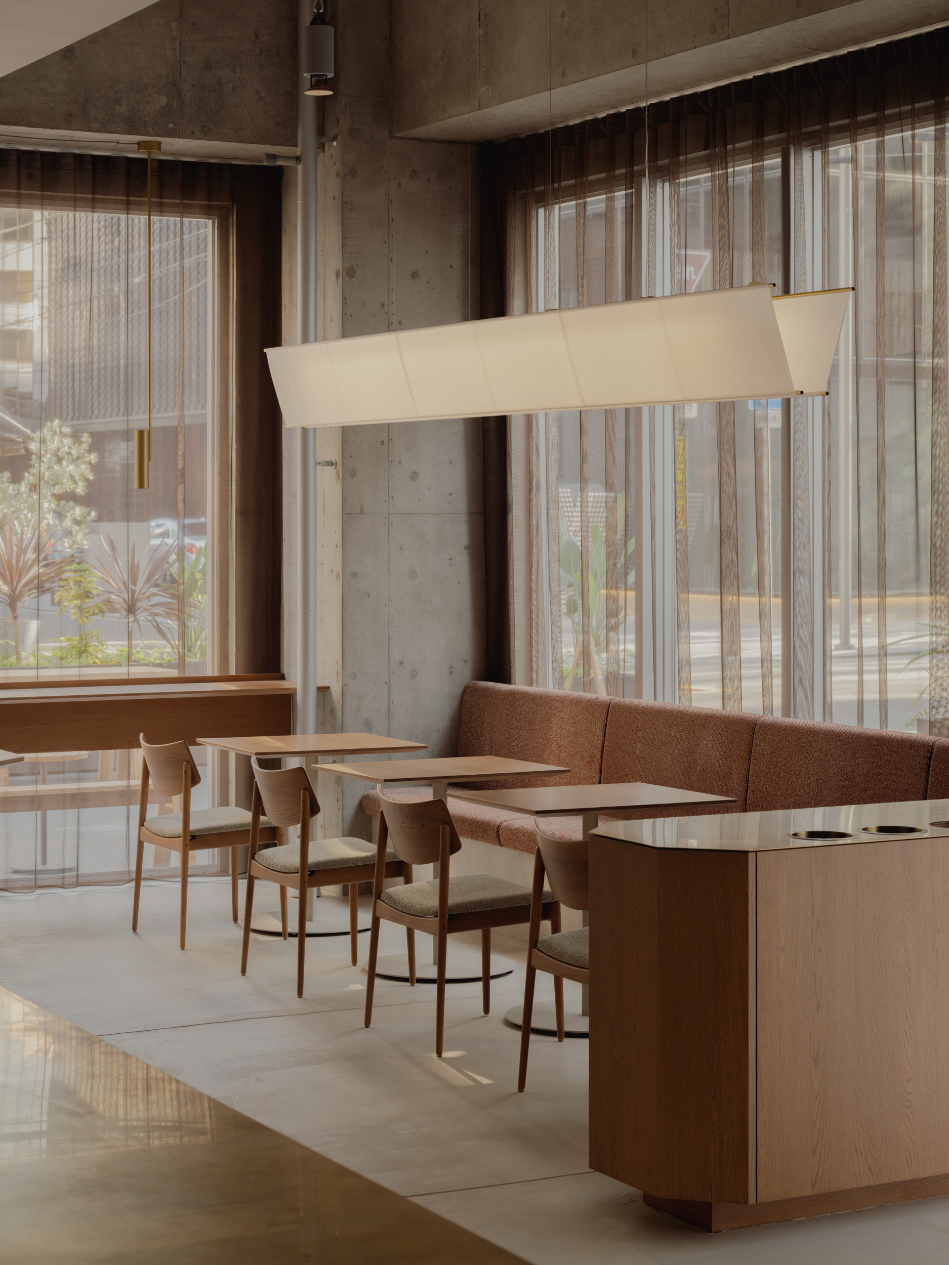 Inspired by the geometric motifs found in local landmarks such as Osaka Castle and Tsutenkaku Tower, the design explores the balance between the bold, Brutalist expression of architecture and the gentle warmth of natural materials. The combination of wood and textiles creates a dialogue between hardness and softness, shadow and light, linearity and geometry—composing a quiet rhythm throughout the space.