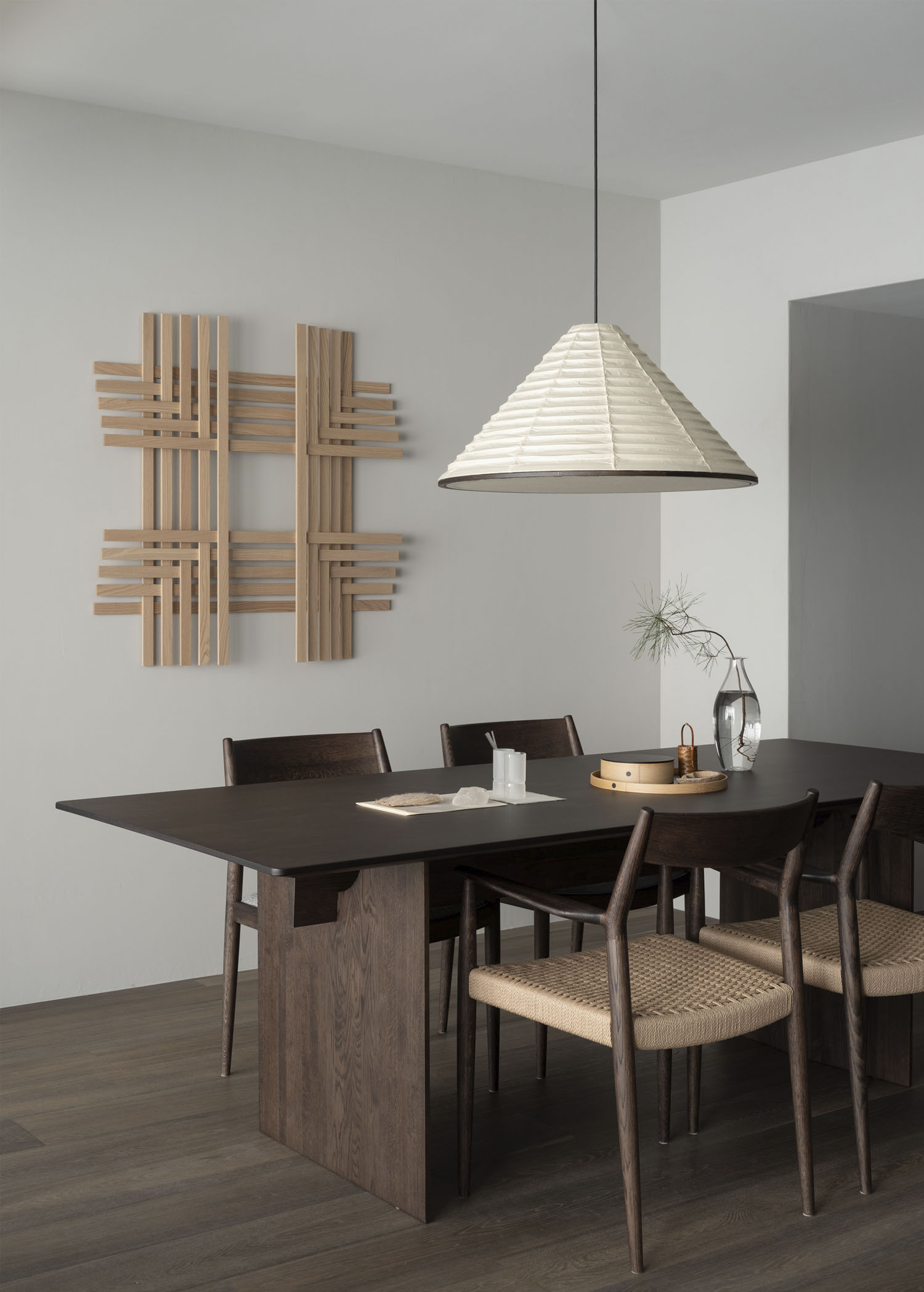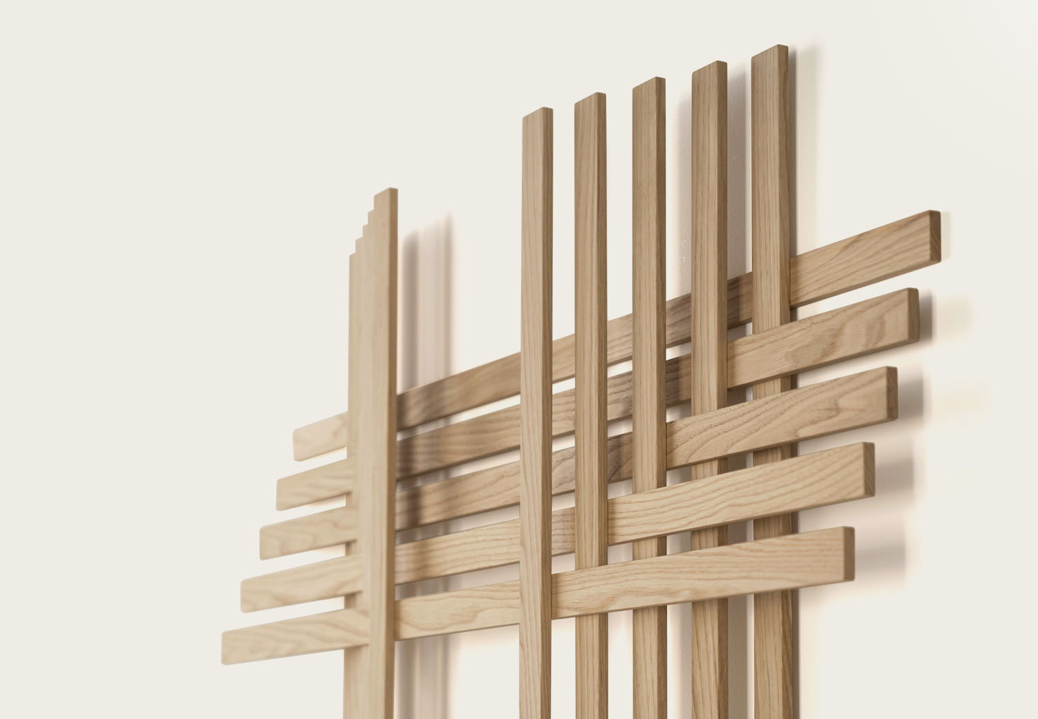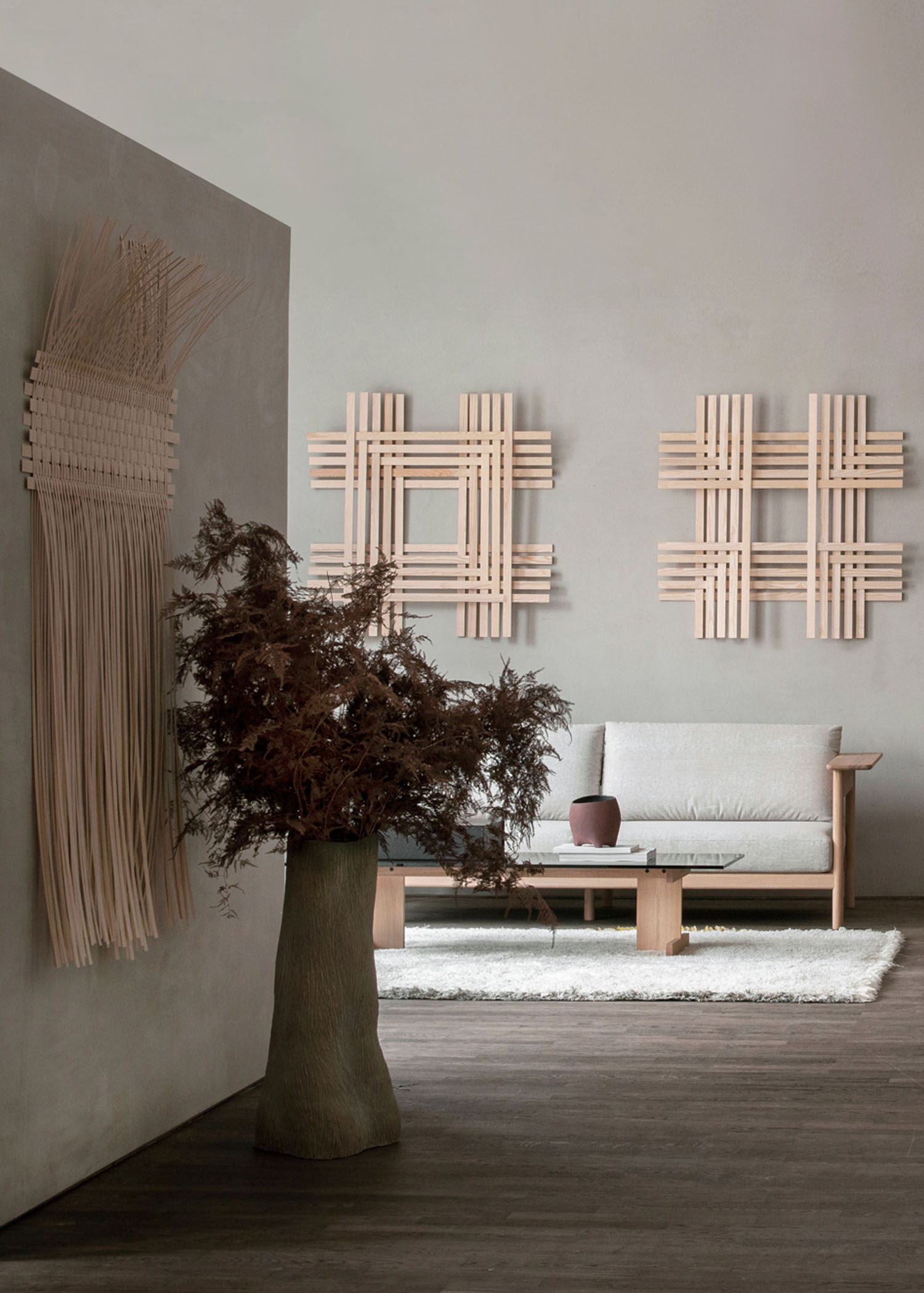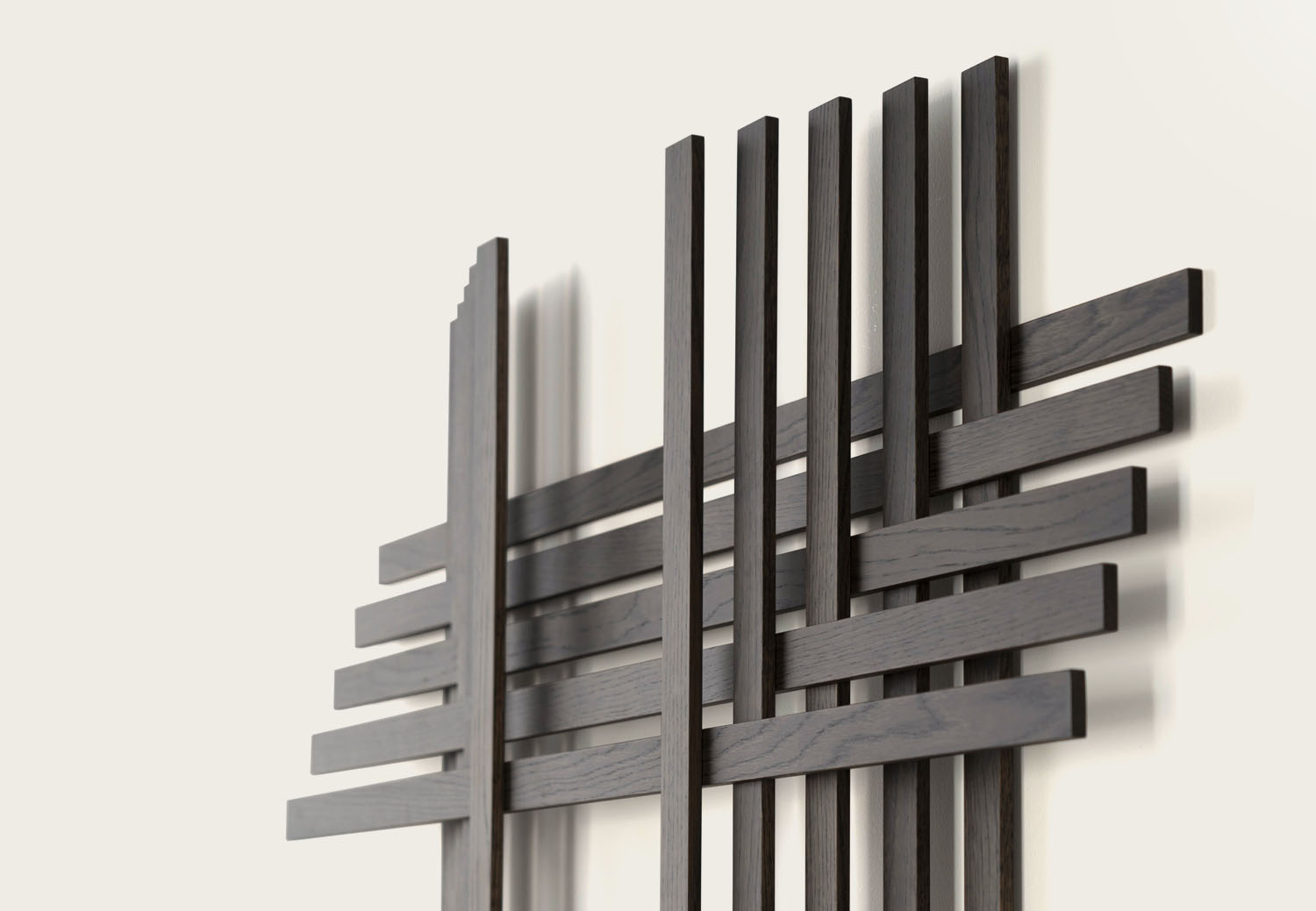 两件艺术品均由实木制成,由此在墙面上创造出立体的三维雕塑。材料采用简单的排列模式,重复运用相同的形状和材料来模拟藤编工艺。两款家具都具有轻盈感、优雅气质和数学构造,在白天光线和阴影的影响下,可以凸显出艺术品的视觉效果。可选择纯栗色或烟熏橡木色。